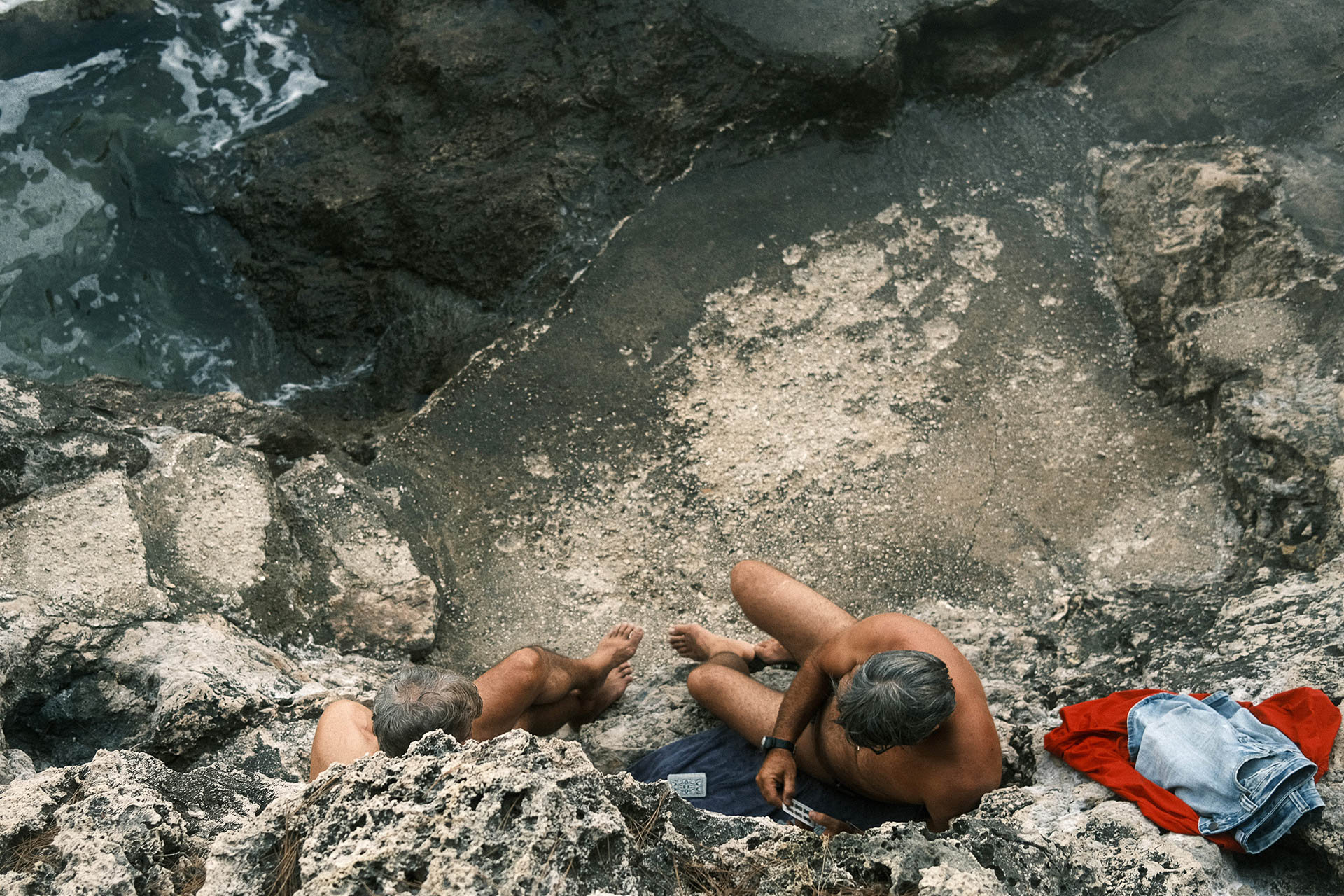 Croatas jogando baralho em uma praia de pedras na região de Dubrovnik.
