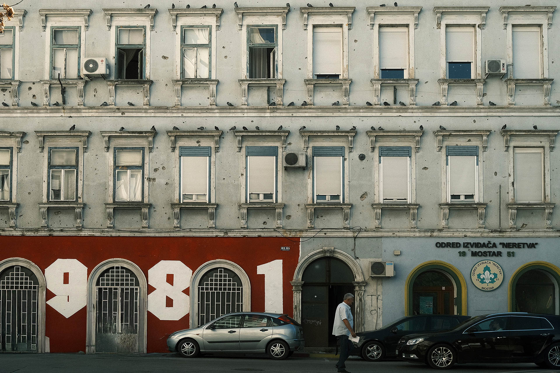 Fachada de prédio marcada por buracos de bala, vestígios da guerra, na cidade de Mostar, Bósnia e Herzegovina.